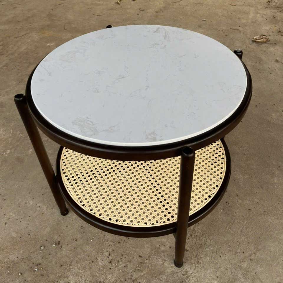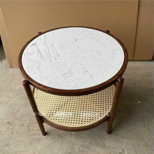 Bàn trà Đan Mây tròn 2 tầng mặt đá có thiết kế khá cá tính, ấn tượng nhưng cũng rất hiện đại và tinh tế. Điểm ấn tượng nhất của bàn trà này đó là sự kết hợp giữa chất liệu khung gỗ tự nhiên, mặt mây và chất liệu đá nhân tạo. Hai tầng cấu tạo và chức năng như nhau, giúp cho khách hàng có thể dễ dàng trong việc bảo quản, cất trữ và lấy ra khi cần.