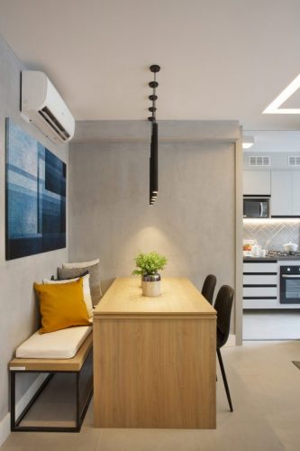 Chúng tôi cũng sử dụng một chiếc ghế dài dựa vào tường để kê bàn ăn, một tính năng tối ưu hóa sự lưu thông của khu vực.