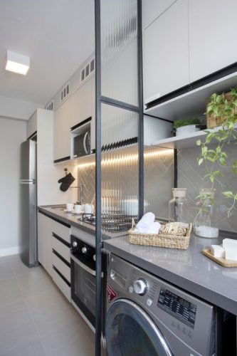 Một vách ngăn bằng kim loại, với kính gợn sóng, ngăn cách khu bếp mà không cản sự xâm nhập của ánh sáng tự nhiên.