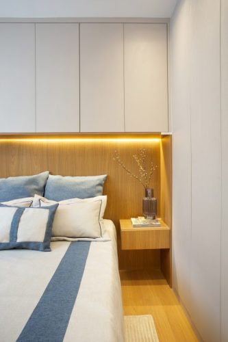 Trong phòng ngủ, chế biến gỗ thông minh một lần nữa trở nên hoang dã: kiến trúc sư chơi với chiều sâu của đầu giường, âm tường, với tủ trên cao, tạo ra một hốc gỗ lấy sáng.