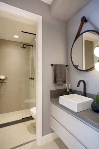 Mặt khác, phòng tắm được phủ một lớp sơn màu xám, phủ lên tường và sàn, với một nửa vách ngăn bằng kính phân chia khu vực ẩm ướt.