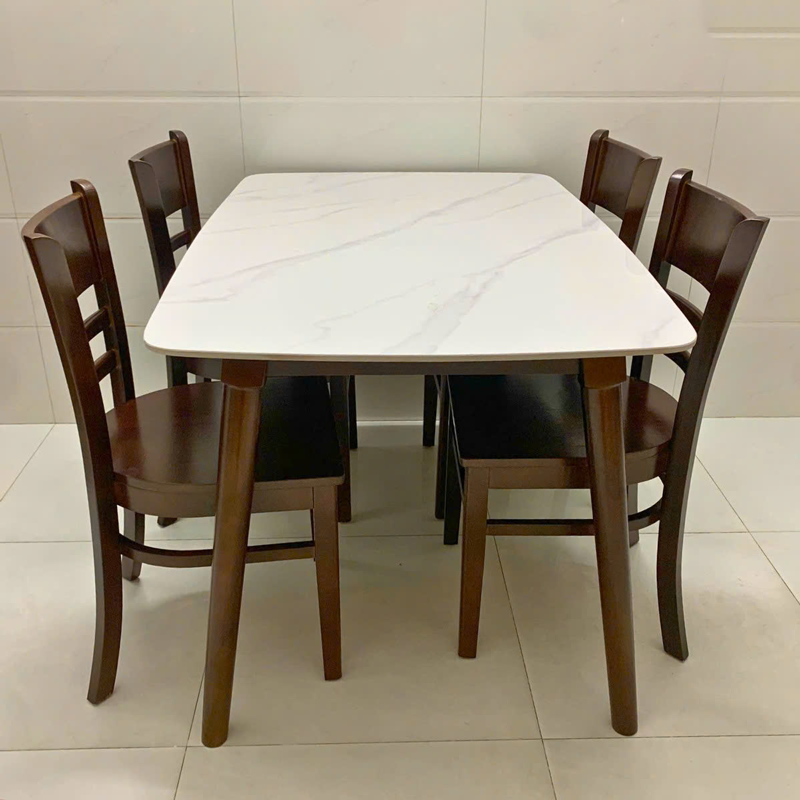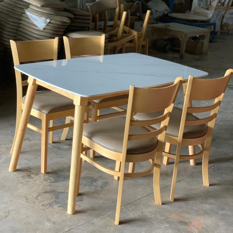 Chất liệu: Gỗ cao su, mặt bàn đá ceramic và nệm bọc simili/ghế mặt gỗ (màu nệm giao ngẫu nhiên hoặc ib shop chọn màu)
