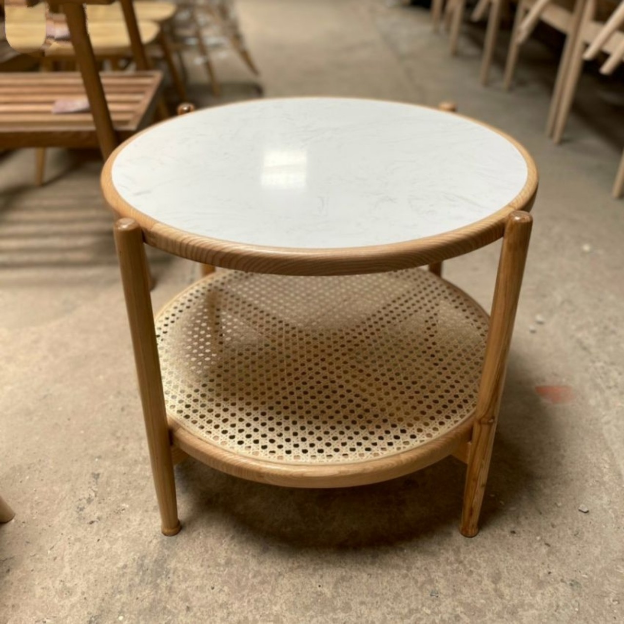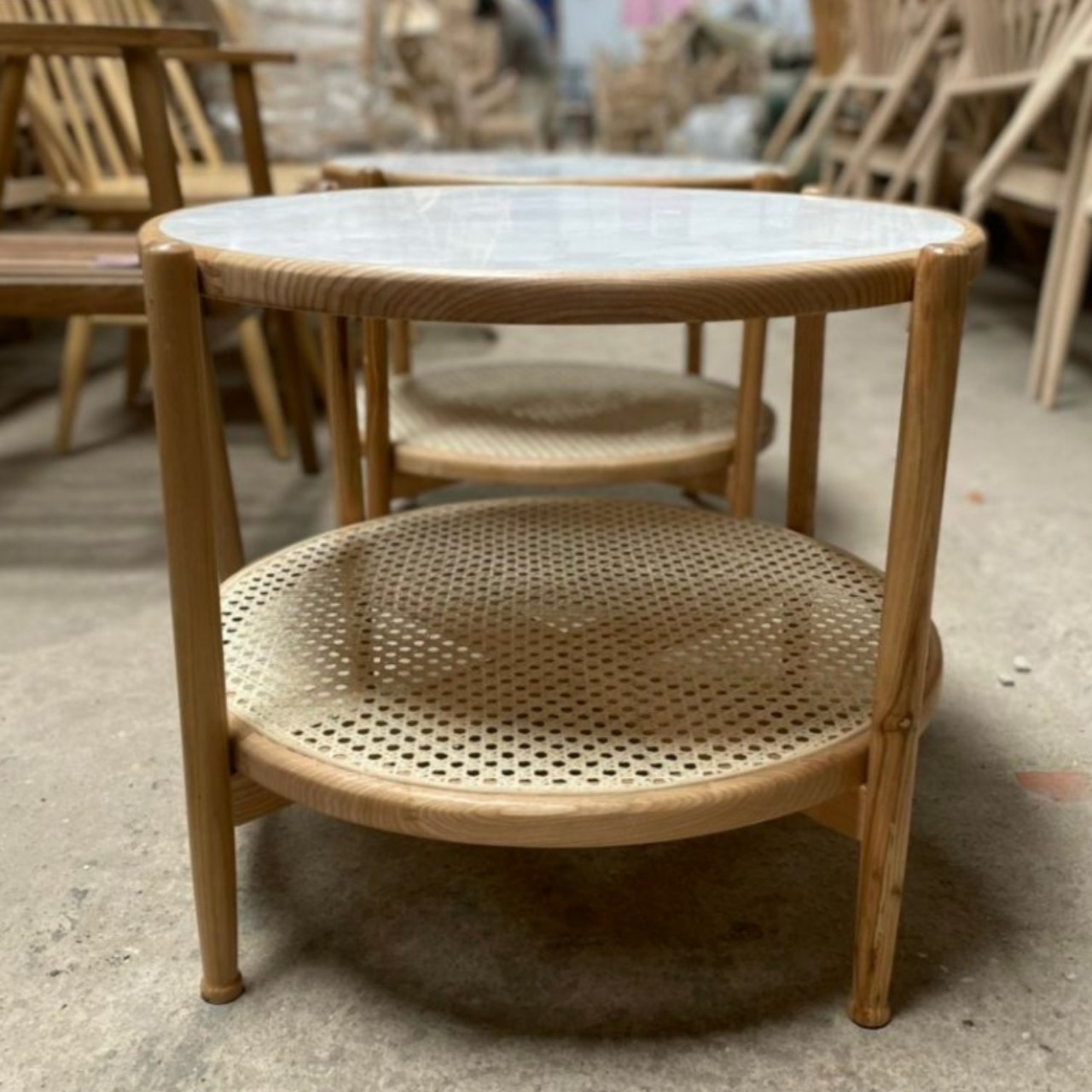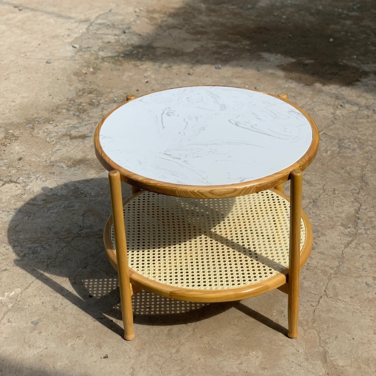 Bàn trà Đan Mây tròn 2 tầng mặt đá có thiết kế khá cá tính, ấn tượng nhưng cũng rất hiện đại và tinh tế. Điểm ấn tượng nhất của bàn trà này đó là sự kết hợp giữa chất liệu khung gỗ tự nhiên, mặt mây và chất liệu đá nhân tạo. Hai tầng cấu tạo và chức năng như nhau, giúp cho khách hàng có thể dễ dàng trong việc bảo quản, cất trữ và lấy ra khi cần.