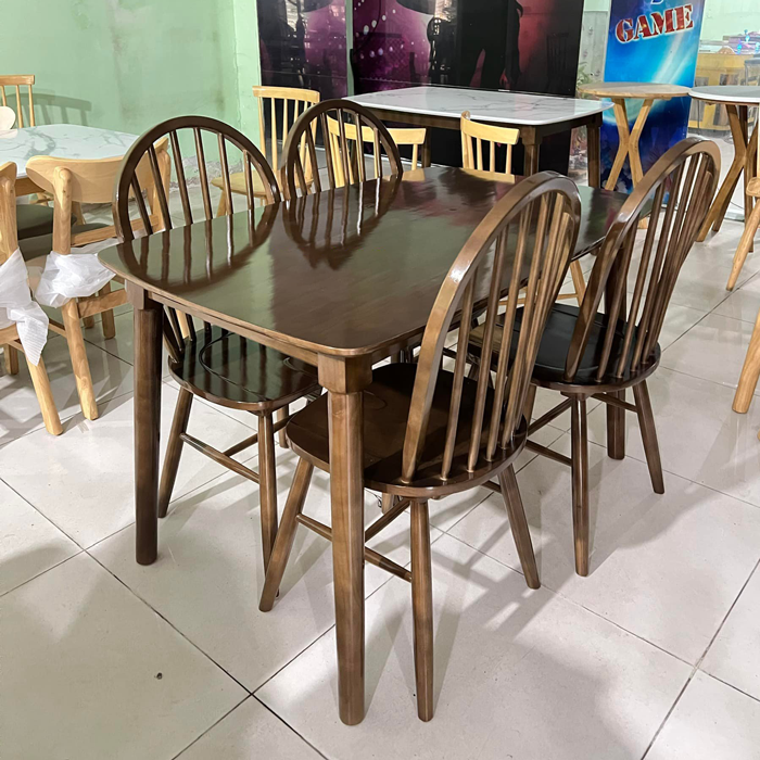 Bộ bàn ăn Ghế Windsor có thiết kế khá cá tính, ấn tượng nhưng cũng rất hiện đại và tinh tế. Điểm ấn tượng nhất của bộ bàn ghế ăn này đó là chất liệu khung gỗ cao su với màu sắc ấm áp, vân gỗ bắt mắt. Sự kết hợp hài hòa màu sắc của vân gỗ được sơn tự nhiên. Bộ bàn ăn cấu tạo thanh thoát và công năng sử dụng phù hợp đảm bảo sự hài hòa với không gian nội thất phòng ăn bên trong nhà bếp.