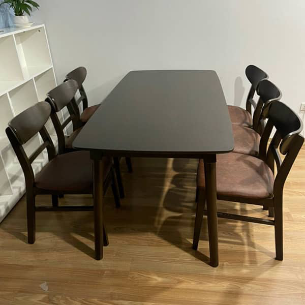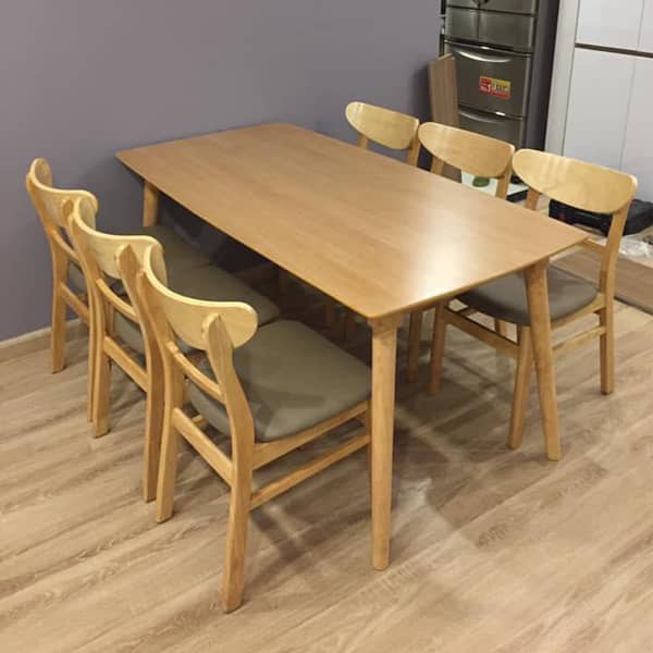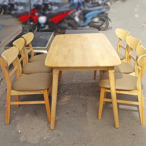 - Chất liệu: Khung chân gỗ cao su; mặt bàn gỗ MDF/hoặc gỗ cao su; nệm bọc simili (Nệm màu ngẫu nhiên)