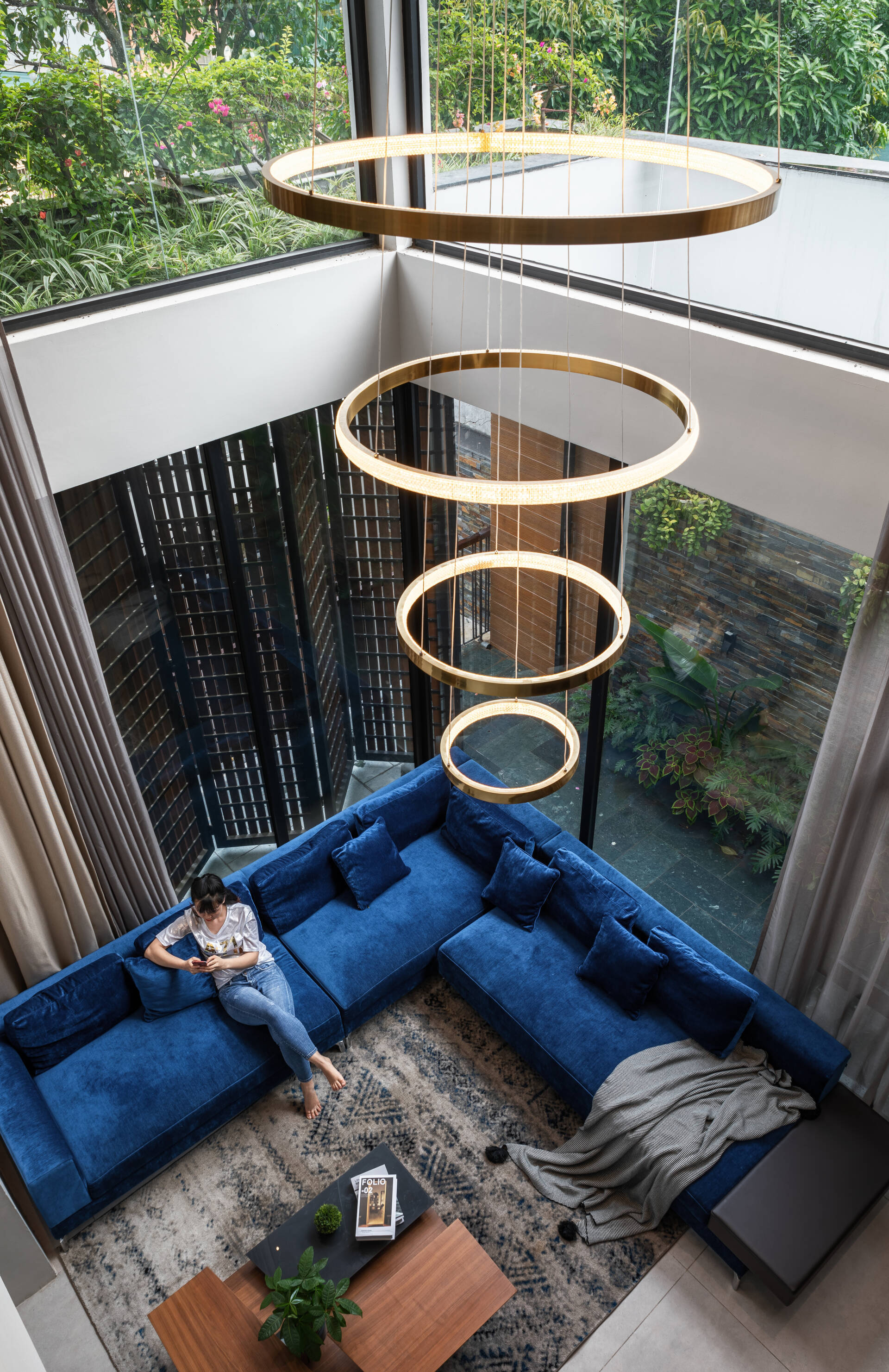 Phòng khách này được thiết kế vô cùng sang trọng và đẳng cấp với chiếc ghế sofa chữ L bằng vải nhung màu xanh tạo điểm nhấn. Tường ốp của phòng khách là tone màu ghi đan xen màu vàng trông nhìn thật lạ mắt. Điểm ấn tượng mà ai cũng nhìn thấy đó là chiếc đèn treo thả bắt mắt được bố trí ở khu vực thông tầng, trung tâm của phòng khách, nổi bật với những vòng tròn lớn và nhỏ, ánh sáng nhẹ nhàng, ấm áp.