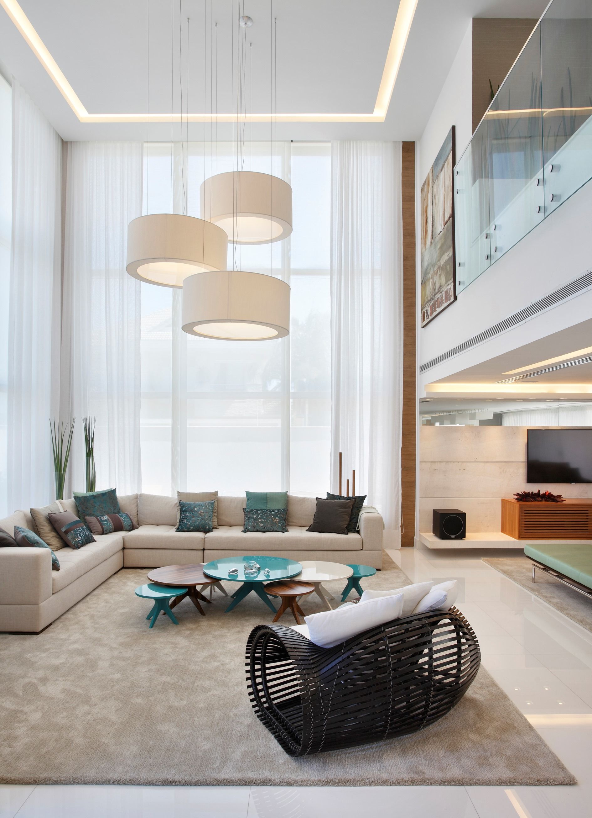 Phòng khách này lấy tone màu trắng làm chủ đạo với hệ cửa sổ lớn đón ánh sáng từ bên ngoài vào. Tuy nhiên, không hề gây chói mắt mà ánh sáng nhẹ dịu khi đi qua tấm màng lớn lắp từ trần đến mặt đất. Đặc biệt là phải kể đến là 3 chiếc đèn giống như khối trụ tròn được thả từ khoảng thông tầng xuống. Vô cùng hài hòa với chiếc sofa bên dưới với vải bọc màu trắng hình chữ L