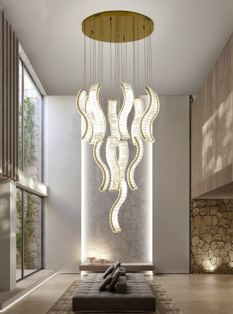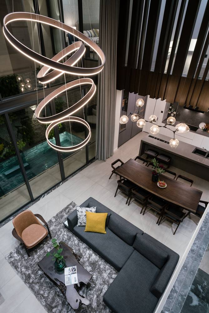 Một trong những yếu tố quan trọng cho không gian phòng khách đó là ánh sáng. Ngoài việc lấy ánh sáng tự nhiên từ những cửa sổ lớn thì ánh sáng từ những chiếc đèn được thả từ trên trần xuống, đẹp lung linh và huyền ảo cũng phần nào giúp tôn lên nét đẹp sang trọng và đẳng cấp nhưng đầy ấm cúng co gian phòng. Ngày nay, với nhiều ý tưởng thiết kế ra đời, nhiều mẫu đèn thả thông tầng cũng ngày càng đa dang, tinh tế và đẹp mắt.
