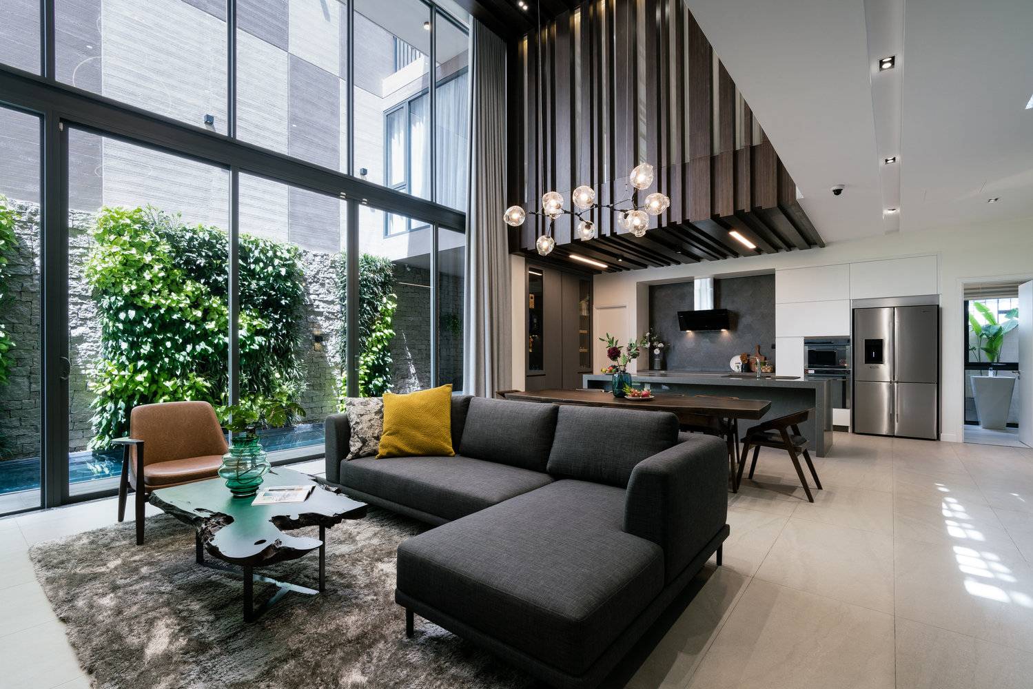 Trần nhà rất cao nhằm mang đến sự rộng rãi, thoáng đãng nhưng cũng khó có món đồ nội thất để trang trí. Đối với đèn thả thông tầng kiểu dáng lạ mắt là một trong những cách tôn lên nét đẹp, cá tính cho thiết kế biệt thự này. Thiết kế thông tầng với không gian phòng khách liền phòng bếp giúp không gian thoáng đãng, tự do. Bức tường kính hiện đại với view hướng vườn xanh mát cho những giờ phút ăn uống vui vẻ, thoải mái.