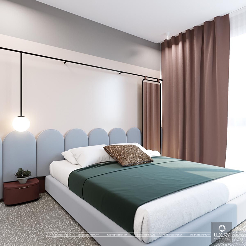 Gam màu trắng được sử dụng làm tông màu chủ đạo thiết kế nội thất chung cư 70m2 từ phòng khách đến phòng ngủ. Phòng ngủ chính được thiết kế khá đơn giản với kệ sách ở đầu giường và một mảng tường được trang trí họa tiết hoa lá đơn giản nhằm mang đến cảm giác thư giãn.