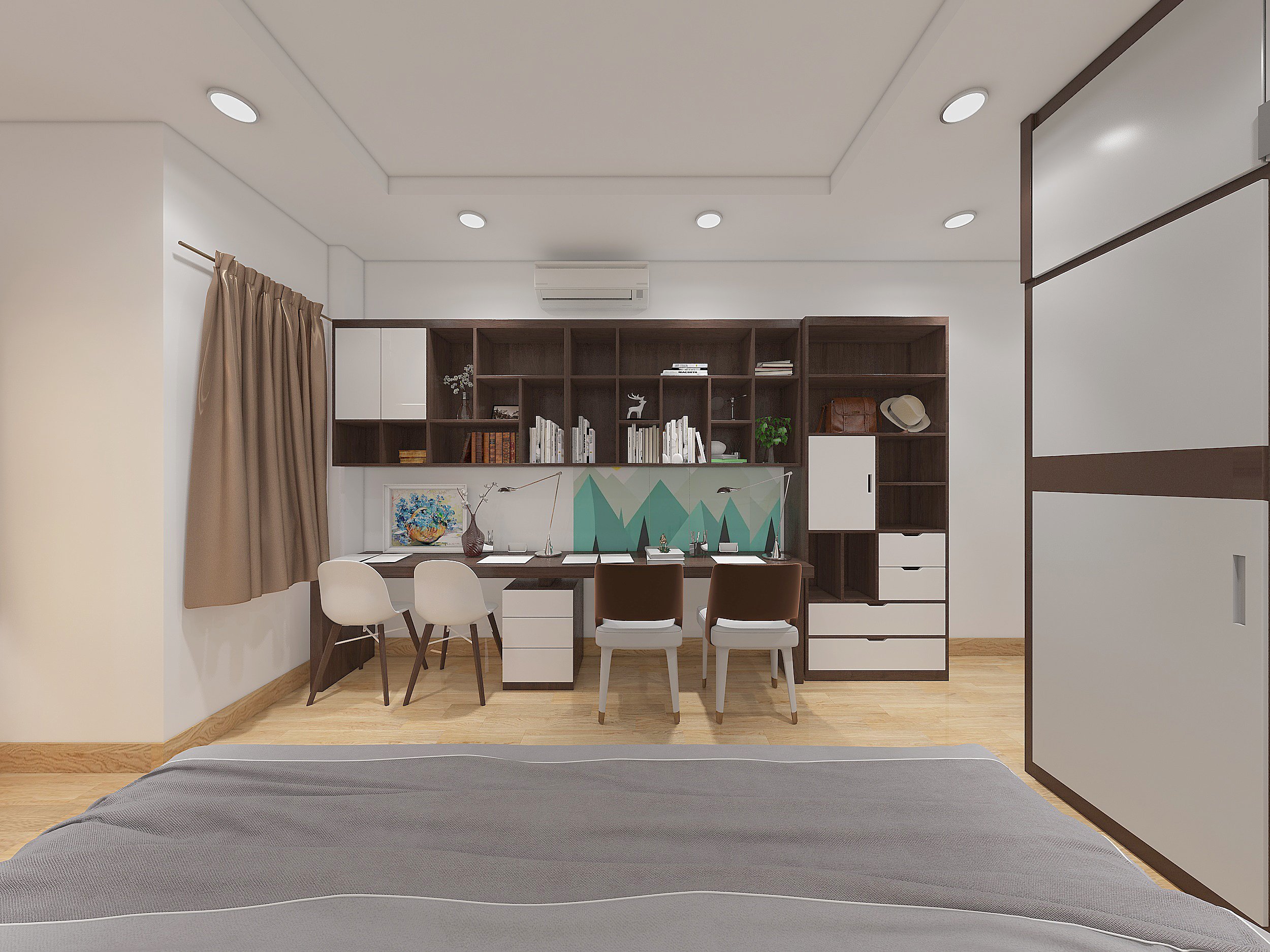 Bên cạnh đó, các thiết kế tủ gỗ đều là các thiết kế gọn gàng khéo léo tạo mặt phẳng tường vừa đảm bảo công năng lại không gây ra cảm giác chật chội cho không gian phòng ngủ. Với thiết kế tủ đa ngăn, kết hợp kệ trang trí, ngăn kéo bàn học, bàn làm việc được ứng dụng triệt để giúp mang đến không gian tiện nghi và cảm giác thoải mái cho gia chủ.